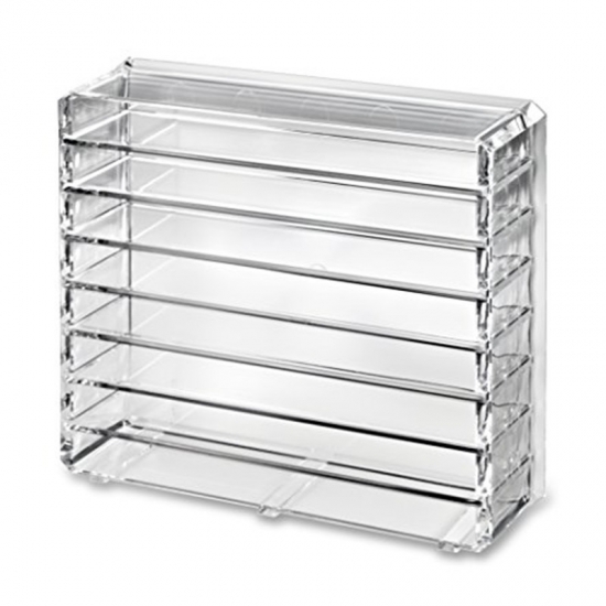 This premium acrylic palette organizer comes with 8 individual spaces for storing standard sized palettes. This organizer is designed with removable dividers and can stand or lay flat. Please note: this product is intended for standard sized palettes, for larger and smaller sized palettes please see our additional palette organizer sizes. Size: 9.75L x 9.5W x 2.7H inches each individual compartment is: 8.6L x 1w x 2.3H inches.