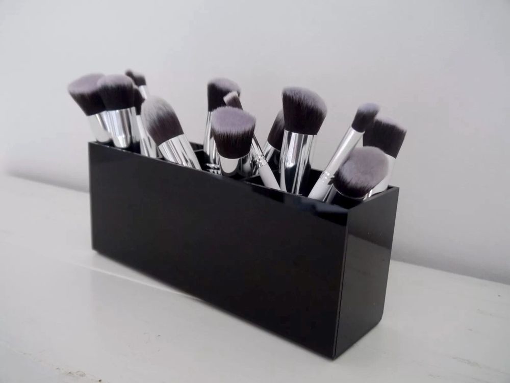 The 3 dividers perspex brush holder can be in black, white clear or marble, any color you like.