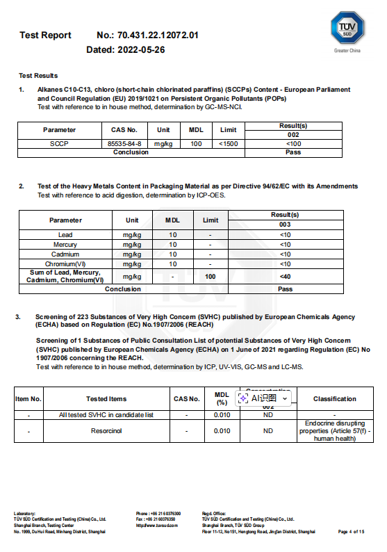 The TÜV certification verifies that our acrylic materials meet strict international safety standards. The following parameters were tested and confirmed to be within compliant limits: