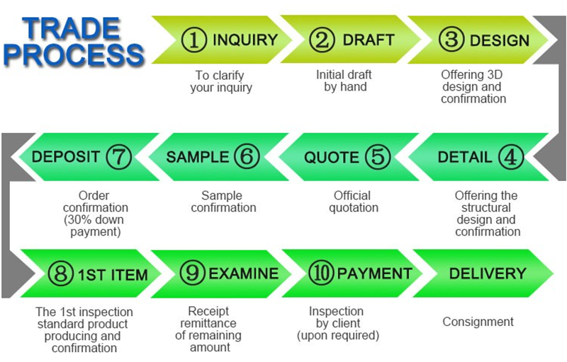 Business Process 1) Choosing some product pictures from our website or send us your own design and sample pictures if you have. 2) Sending us your enquires,and we will reply to your enquies within one working day. 3) To check our quality and handicraft of sample at first if you think its necessary. 4) The sample approved,then you could place your order with our sales. 5) Making 30% payment in advance.We are going to arrange producing after your payment comes into our payment account. 6) We will keep you informed the productions process.The 70% balance of payment shall be made before delivery. 7) We will help you book the shipping space for deliering products. 8) Giving your excellent after-sales service,and follow up your sales status.