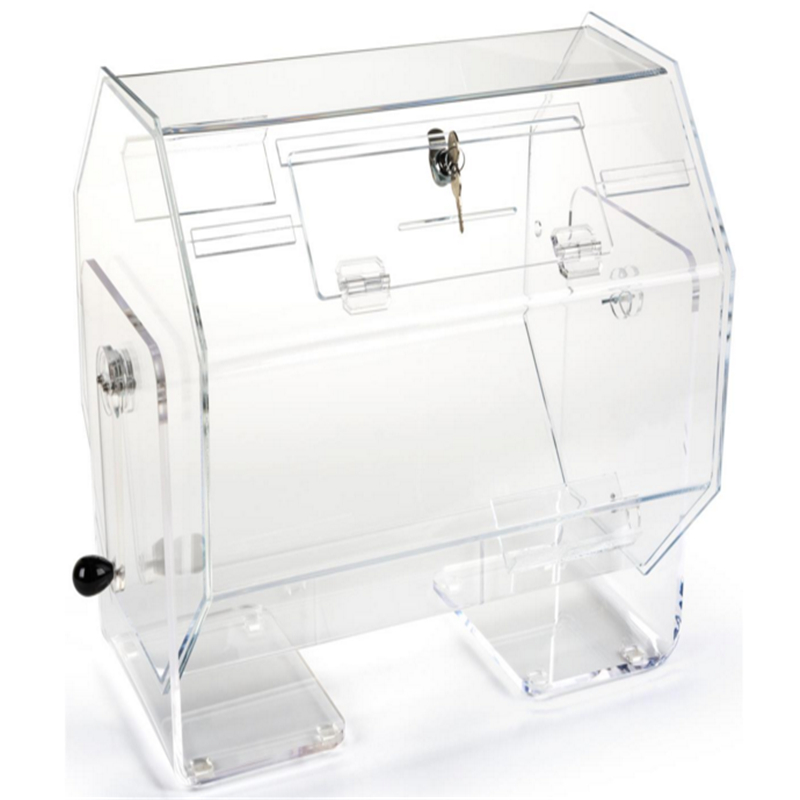 This lottery box has a rotating body, which is made of 3/16 inch thick acrylic and has an attractive octagonal design. The raffle drum has a hinged lid and a 6-inch wide slot for inserting tickets. To keep your belongings safe, we sell raffle drums with built-in cam locks and two accompanying keys.