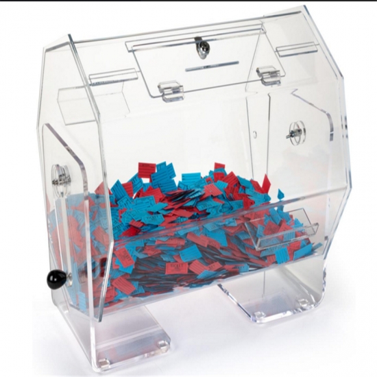 These raffle ticket tumblers are rotating raffle drums that serve as a perfect collection container for tickets, sweepstakes entries, and ballots. A medium/large/samell sized raffle drum such as this spinning raffle box is the perfect size to suit for tables at tradeshows or in the office for drawings.