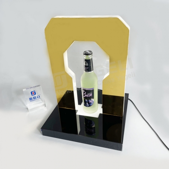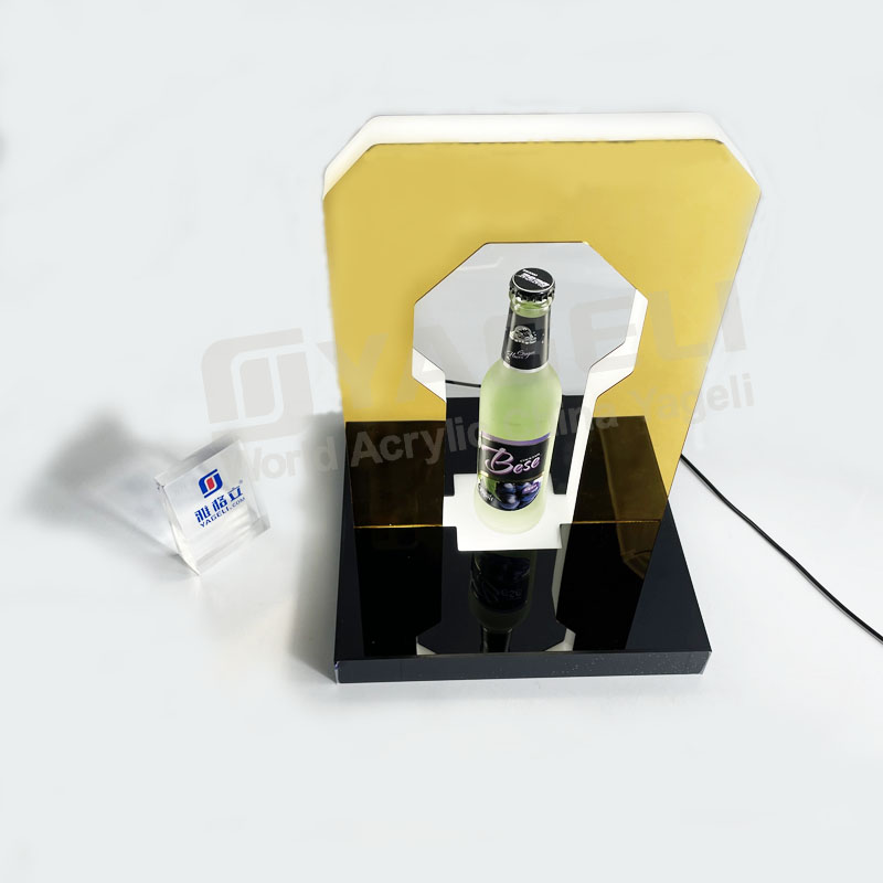 Illuminated acrylic wine display with customizable size, lighting color, and logo branding. Factory-direct with sample support and flexible MOQ.