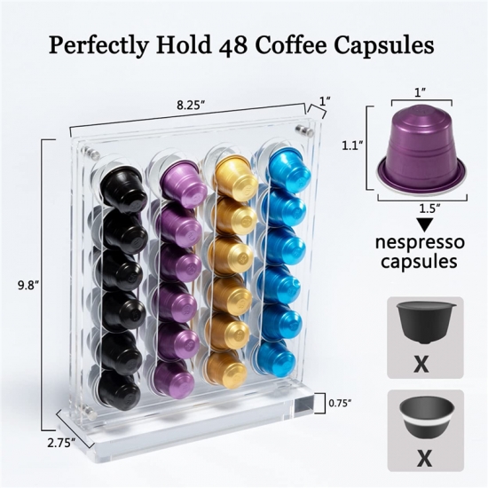 Large capacity: The overall size is 9.8 "high x 8.2" long x 2.75 "wide and can hold 48 coffee capsules with a diameter of 1.45 inches. (Tip: Please check the size of the coffee capsule before buying)