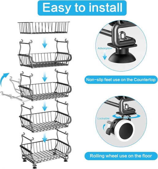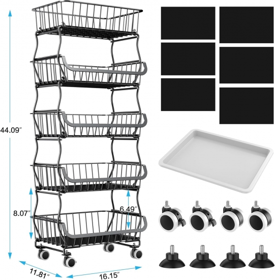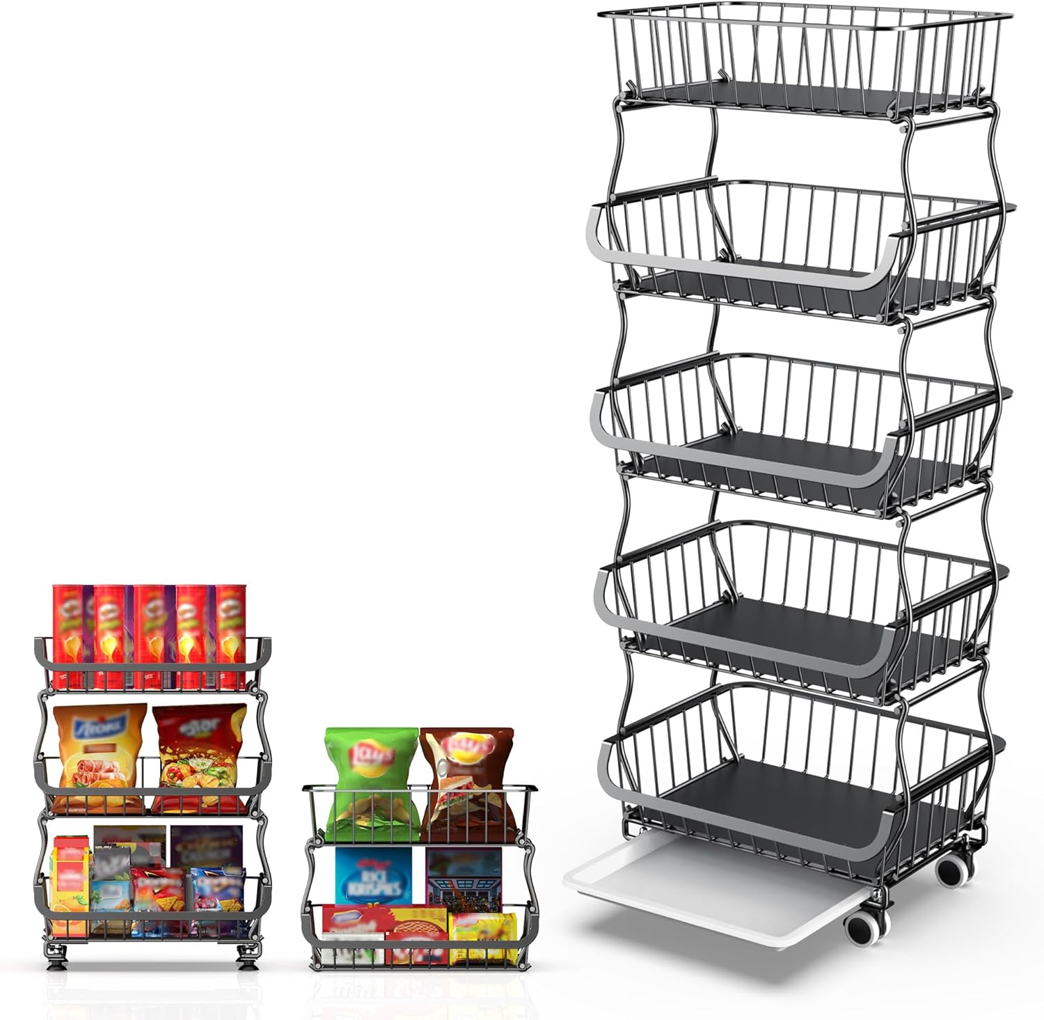 [Versatile Commercial Organizer]: 5 tier large stackable detachable snack organizer easy to access and display household items, its design allows it to function as a fruit, food, drinks and vegetable basket, a kitchen storage unit, a snack rack, bathroom, bedroom, laundry room, supermarket storage rack or anywhere you need storage and organize, effectively save space in supermarkets and homes, make your area always look professional.