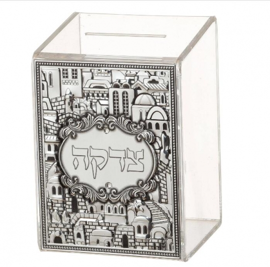 CLEAR ACRYLIC JERUSALEM TZEDAKAH BOX, color can be custom,