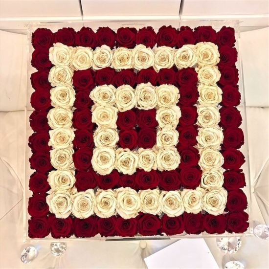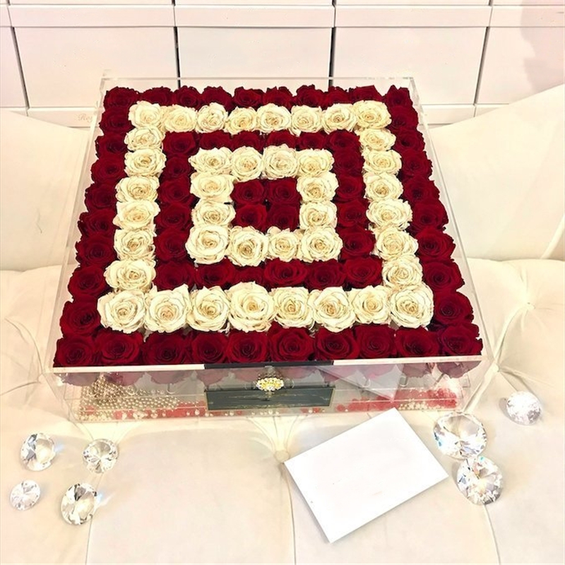 Our acrylic rose box displays your everlasting roses in the most dramatic way-suspended in a transparent box, you can admire the flowers 360 degrees.