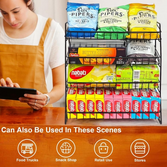 Professional Candy Display Rack - Our 2024 upgraded candy rack display stand features a new "snap-on" installation system, compared to the first generation "hook" style. This enhancement makes the structure more stable and installation even easier, saving you time. With its 4-tier structure, it offers plenty of space to showcase a variety of chips, popcorn, candies, and snacks.