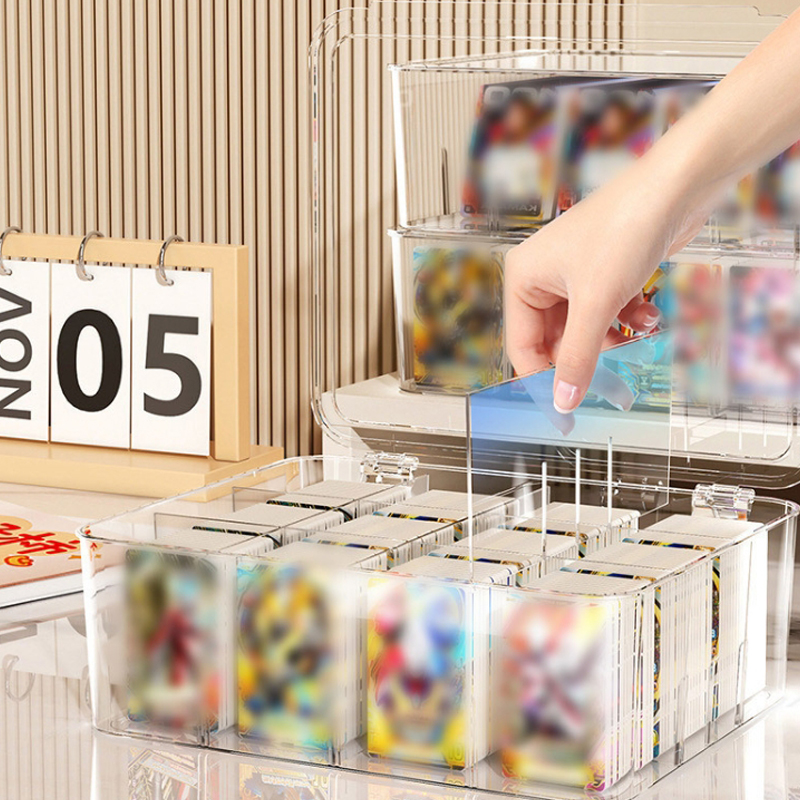 The display case is made of high-strength transparent plastic to ensure durability and visibility. It features removable partitions to divide the interior into different storage units. The lid features a secure snap-lock mechanism for easy opening/closing while keeping the cards dust-free. The base and wall structure allows for stable stacking, with precise dimensions to fit standard-sized collectible cards.