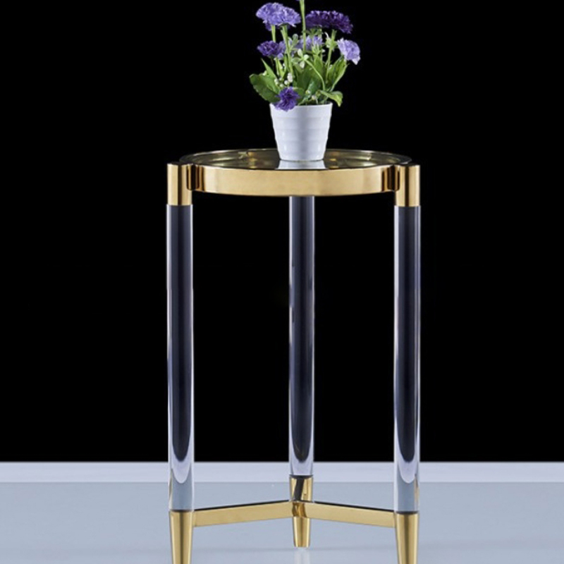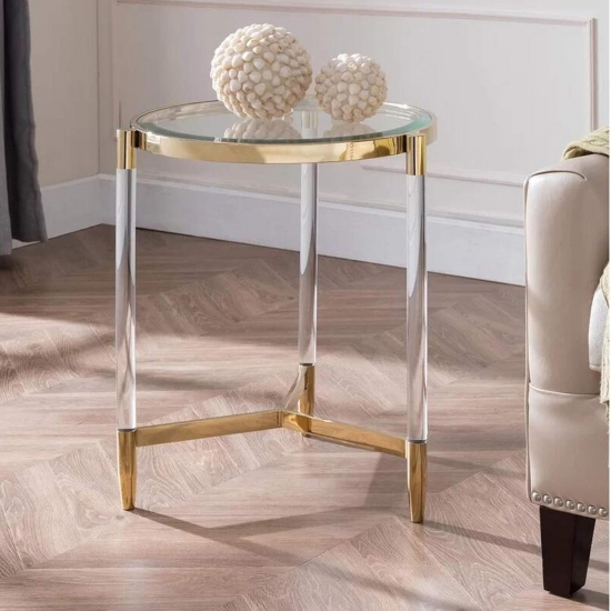 This modern round coffee table features a sleek clear glass top supported by a gold - plated metal frame and transparent acrylic legs, creating a stylish and elegant centerpiece for your living room.