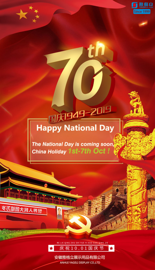To celebrate this major festival, Yageli will have a 7-day holiday, from the 1st to the 7th,Oct.