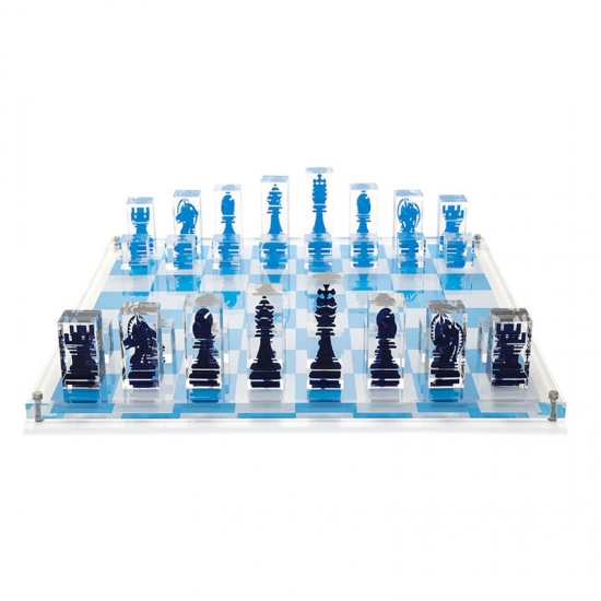 This acrylic chess set is crafted from high-quality transparent acrylic material, with the chessboard surface featuring a checkerboard pattern. The squares on the chessboard alternate between transparent acrylic and blue-tinted acrylic materials, creating a visually stunning contrast effect. The chess pieces, including the king, queen, rook, knight, bishop, and pawn, are all made from acrylic material. The pieces feature a modern block-style design while retaining the classic contours of traditional chess pieces. The edges of the board are enclosed by an acrylic frame and secured at the corners with metal rivets, ensuring stability during gameplay.
