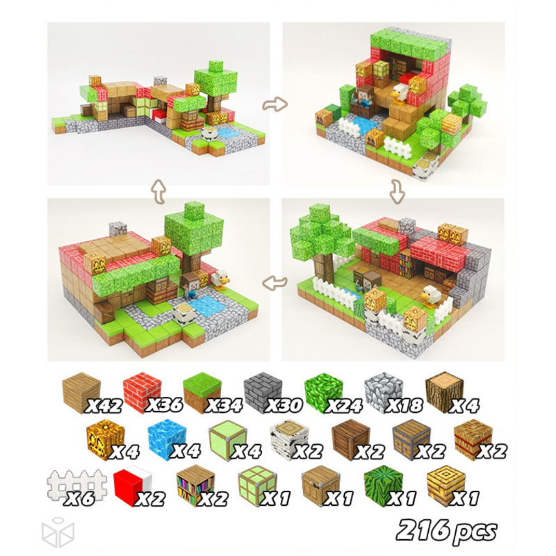 This magnetic building block set is inspired by popular game styles. It consists of numerous small cube-shaped magnetic building blocks in a variety of colors and textures, simulating elements such as grass, wood, and stones found in game worlds. These blocks are equipped with powerful magnets, allowing for easy connection and disassembly, and support the construction of various structures such as houses, trees, and characters. Additionally, it includes special-shaped accessory blocks that can be used to add details such as doors, windows, and decorative elements, enhancing the realism of the constructed scenes.
