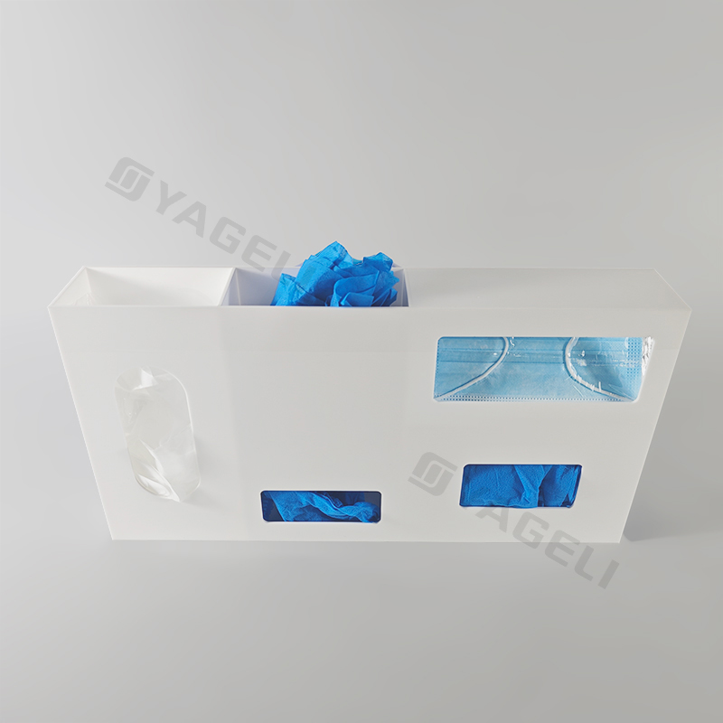 Durable wall-mounted acrylic gloves dispenser, designed for high-traffic medical or industrial environments. Available in single or multiple compartments. Logo printing & size customization supported.