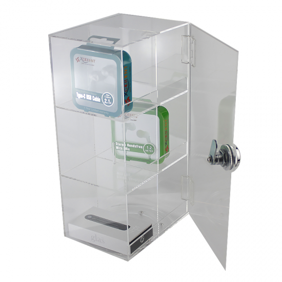 The transparent nature of this secure display cabinet ensures that the focus is on the products inside. Customized size options available .
